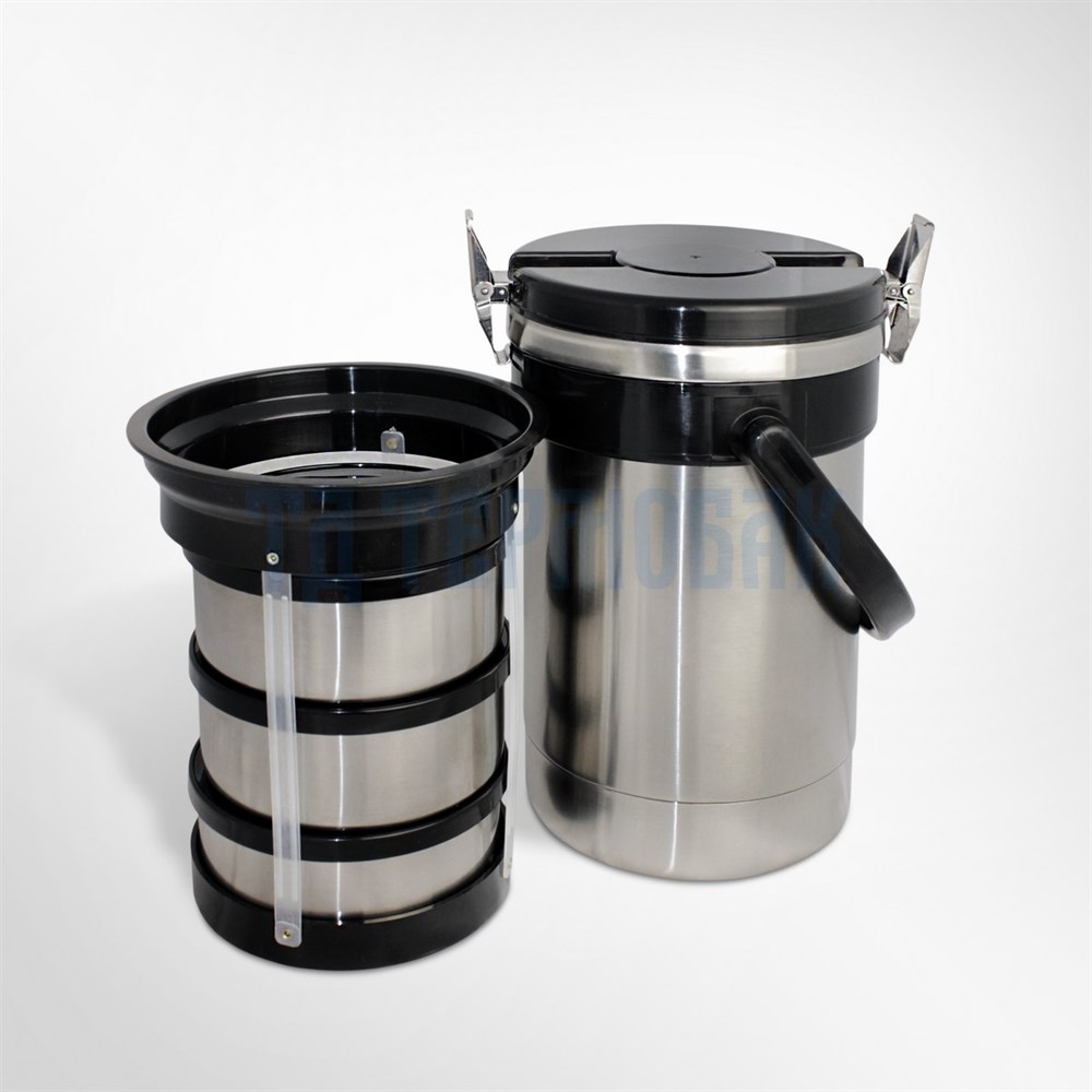 Бытовой термос для горячего питания с 3-мя контейнерами по 600мл из нержавеющей стали. Предназначен для вторых блюд. Имеет с широкую горловину. Контейнеры устанавливаются в специальную корзину, надёжно фиксирующую их положение внутри корпуса. Чтобы достать контейнер, нужно извлечь корзину из термоса и опустить её верхний обод вниз, скручивая по спирали.